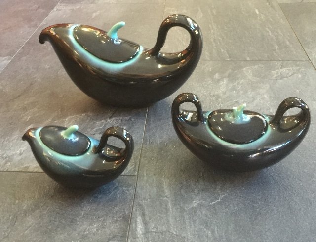 Aladdin tekandeAladdin tekande, sukkerskål og mælkekande, af ove Rasmussen for Søholm i 1950erne. Sukkerskål med skade på lågknop
