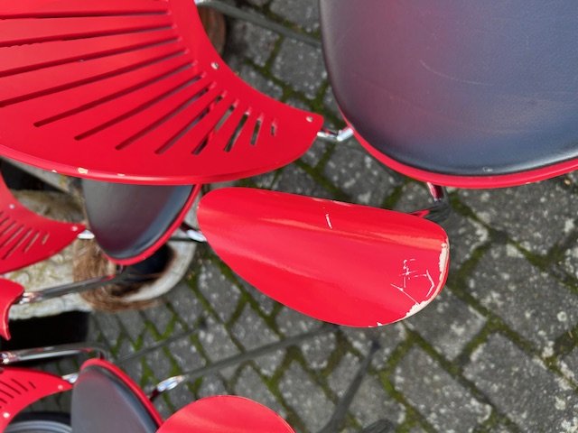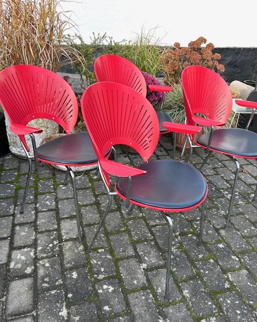 Nanna Ditzel Trinidad stoleNanna Ditzel. Røde Trinidad stole med armlæn og sort lædersæde, Fredericia Furniture, 2010.
