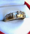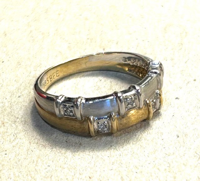 Ring af rød og hvidguld med hvide sten, stemplet 585. BEE.