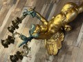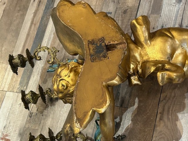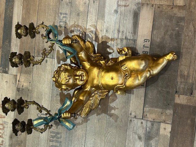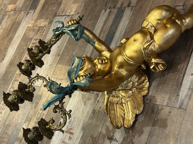 Ældre engel i træ og gesso, med bronze lysestager i hænderne.