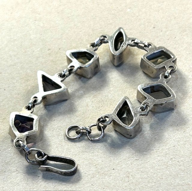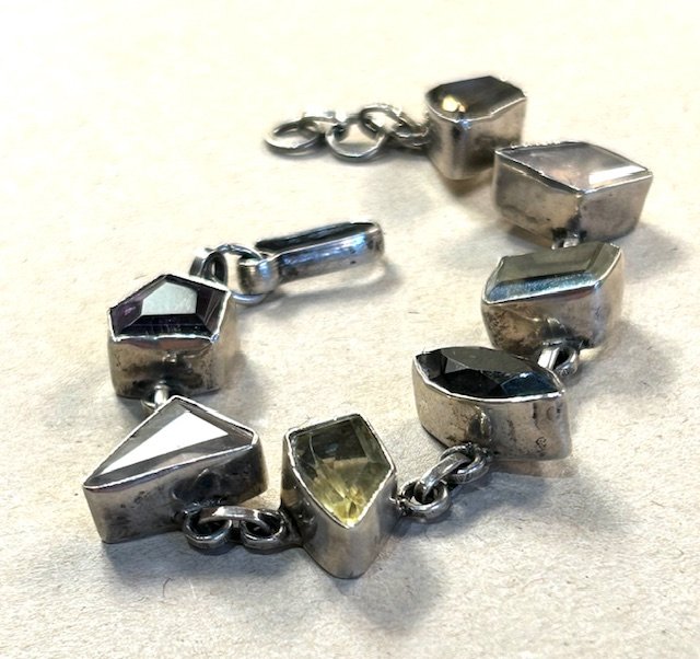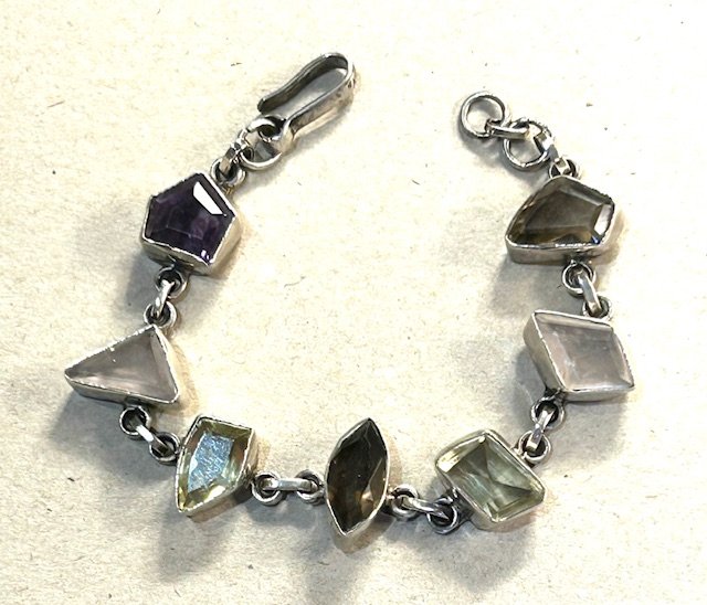 Armlænke i sterlingsølv stemplet 925s med indfattet forskellige kvartskrystaller.