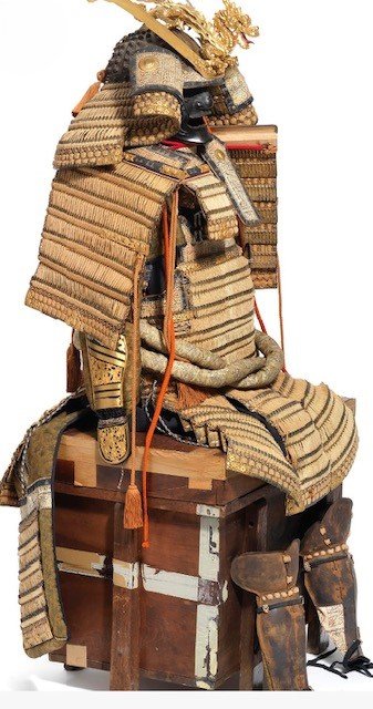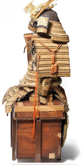 NB. Stof og læder, affarvet, med slid patina og skader, kasse med tape.